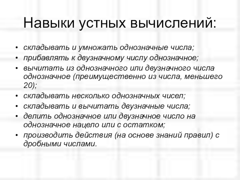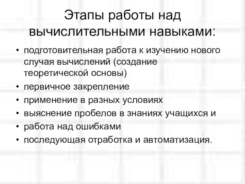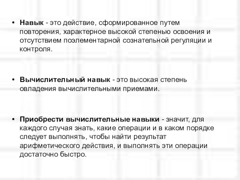 Приобрести вычислительные навыки - значит, для каждого случая знать, какие операции и в каком порядке следует выполнять, чтобы найти результат арифметического действия, и выполнять эти операции достаточно быстро.