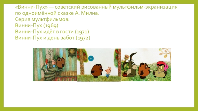 Слайд 5«Винни-Пух» — советский рисованный мультфильм-экранизация по одноимённой сказке А. Милна. Серия мультфильмов: Винни-Пух
