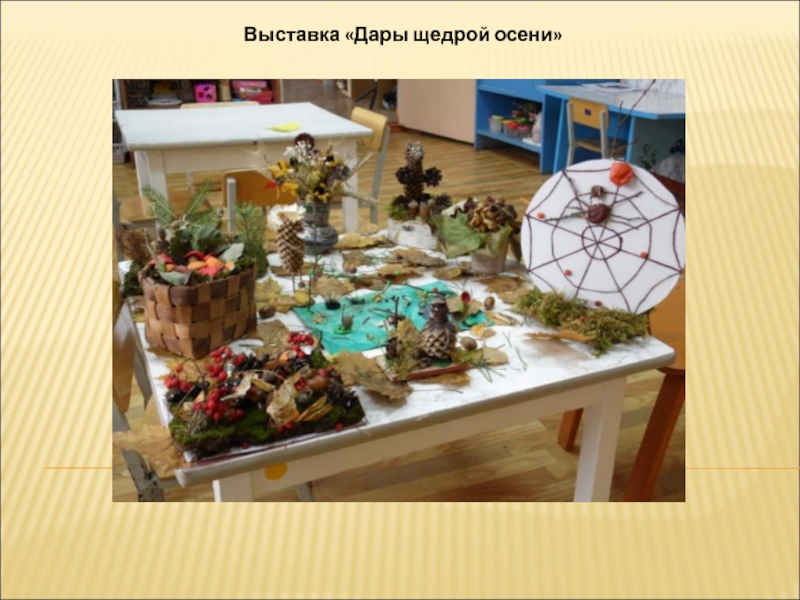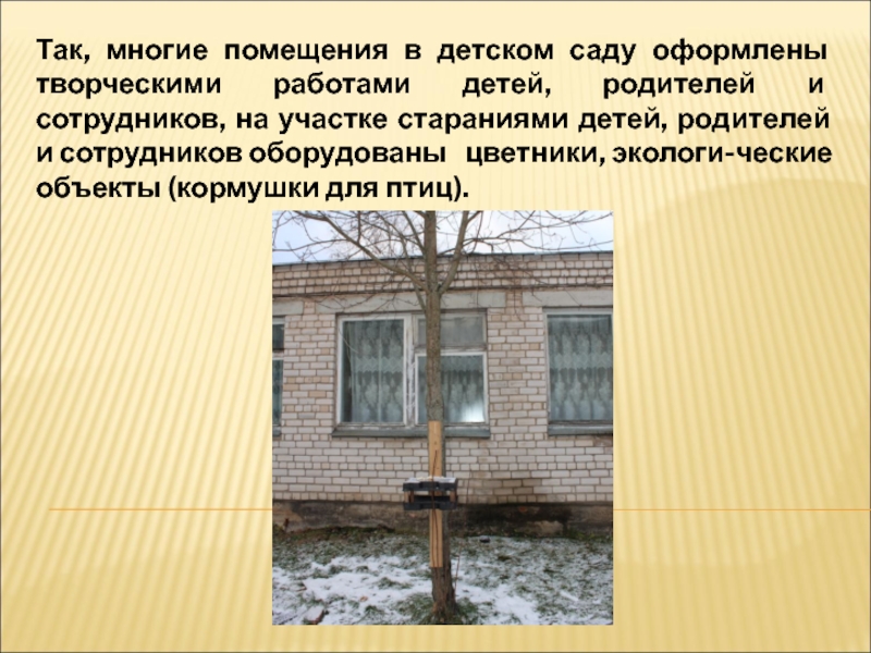 Слайд 11Так, многие помещения в детском саду оформлены творческими работами детей, родителей