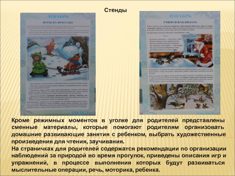 Кроме режимных моментов в уголке для родителей представлены сменные материалы, которые