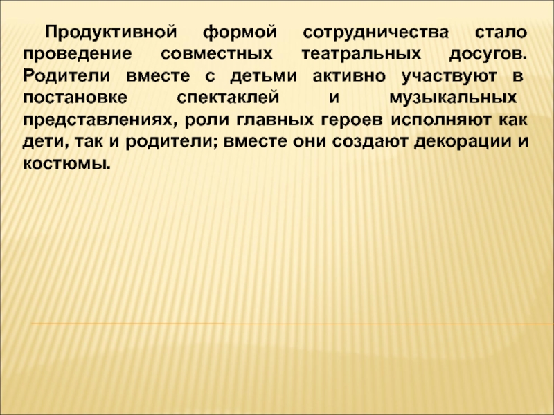 Слайд 4Продуктивной формой сотрудничества стало проведение совместных театральных досугов. Родители вместе с