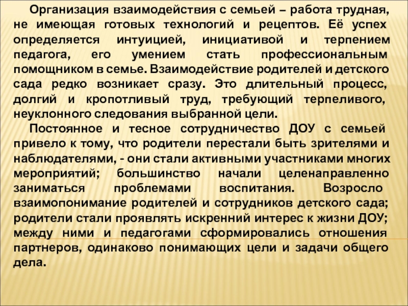 и рецептов. Её успех определяется интуицией, инициативой и терпением педагога, его умением стать профессиональным помощником в семье. Взаимодействие родителей и детского сада редко возникает сразу. Это длительный процесс, долгий и кропотливый труд, требующий терпеливого, неуклонного следования выбранной цели.
