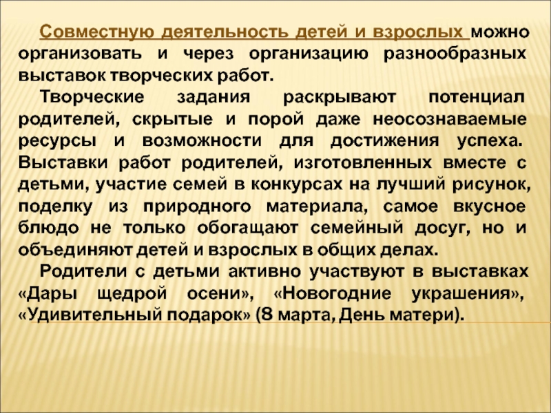 Творческие задания раскрывают потенциал родителей, скрытые и порой даже неосознаваемые ресурсы и возможности для достижения успеха. Выставки работ родителей, изготовленных вместе с детьми, участие семей в конкурсах на лучший рисунок, поделку из природного материала, самое вкусное блюдо не только обогащают семейный досуг, но и объединяют детей и взрослых в общих делах.