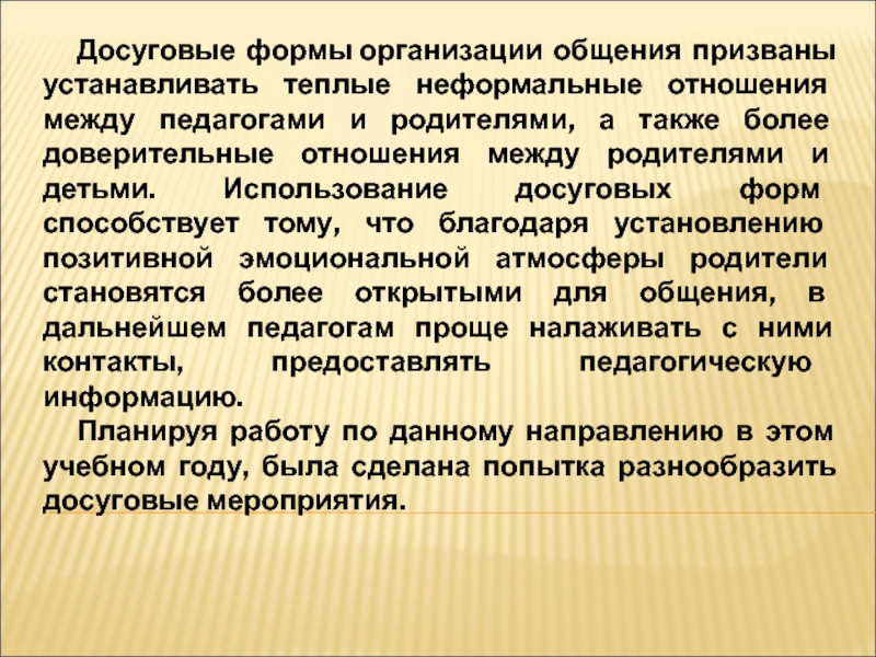 Слайд 3Досуговые формы организации общения призваны устанавливать теплые неформальные отношения между педагогами и