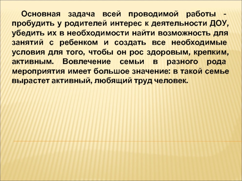 Слайд 17Основная задача всей проводимой работы - пробудить у родителей интерес к