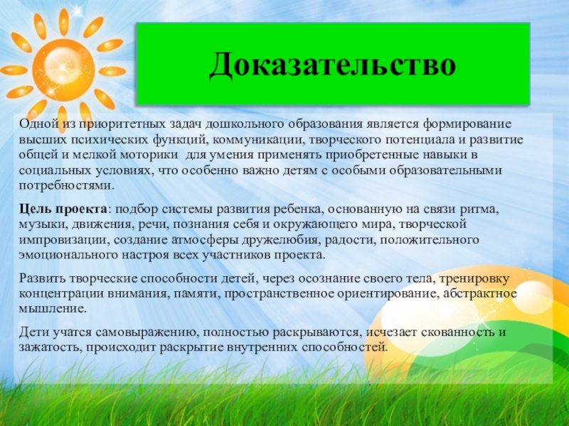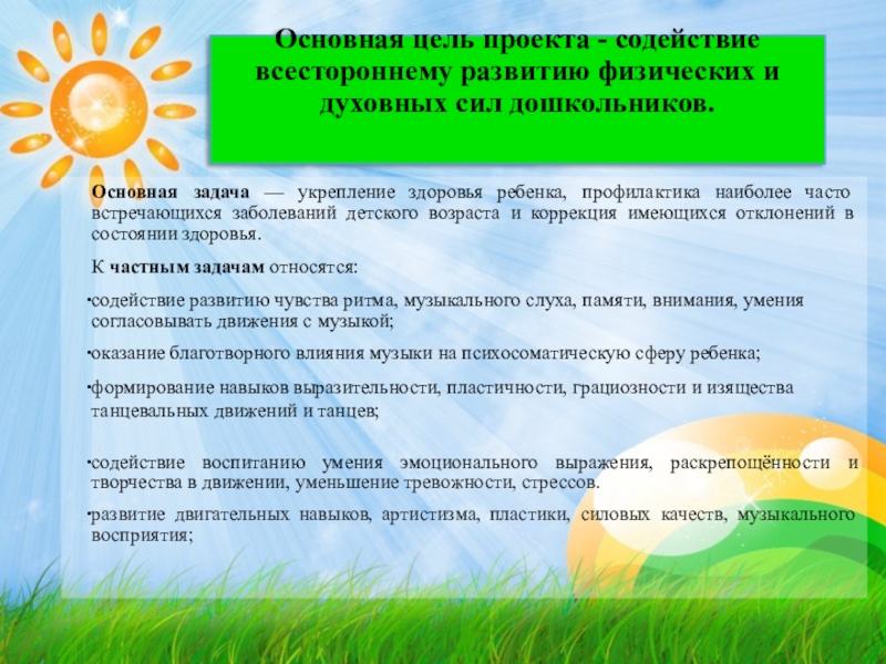 Цель проекта: подбор системы развития ребенка, основанную на связи ритма, музыки, движения, речи, познания себя и окружающего мира, творческой импровизации, создание атмосферы дружелюбия, радости, положительного эмоционального настроя всех участников проекта.