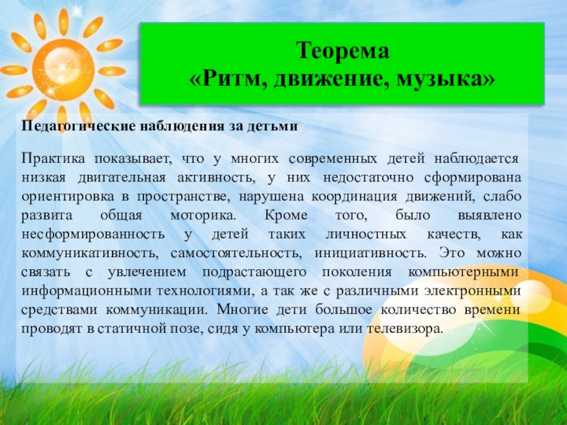 многих современных детей наблюдается низкая двигательная активность, у них недостаточно сформирована ориентировка в пространстве, нарушена координация движений, слабо развита общая моторика. Кроме того, было выявлено несформированность у детей таких личностных качеств, как коммуникативность, самостоятельность, инициативность. Это можно связать с увлечением подрастающего поколения компьютерными информационными технологиями, а так же с различными электронными средствами коммуникации. Многие дети большое количество времени проводят в статичной позе, сидя у компьютера или телевизора.