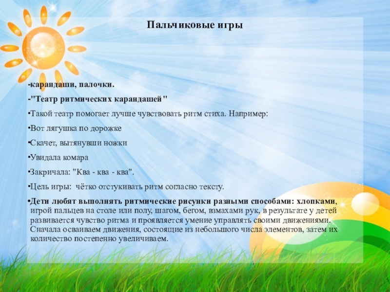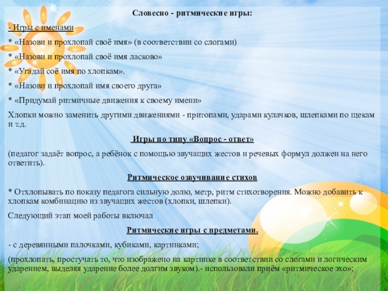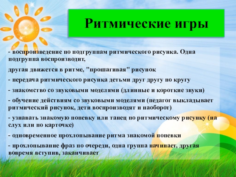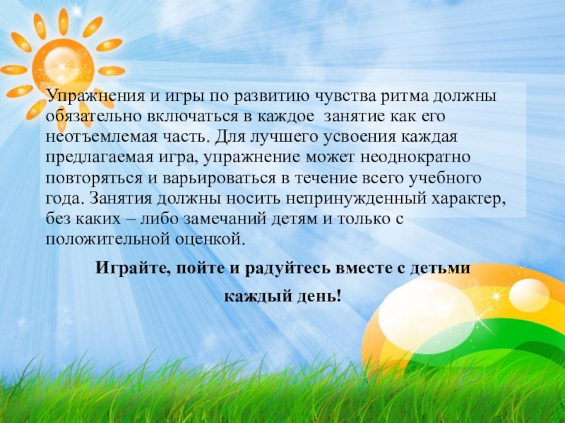 Слайд 25Упражнения и игры по развитию чувства ритма должны обязательно включаться в