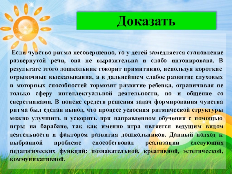 ритма несовершенно, то у детей замедляется становление развернутой речи, она не выразительна и слабо интонирована. В результате этого дошкольник говорит примитивно, используя короткие отрывочные высказывания, а в дальнейшем слабое развитие слуховых и моторных способностей тормозит развитие ребенка, ограничивая не только сферу интеллектуальной деятельности, но и общение со сверстниками. В поиске средств решения задач формирования чувства ритма был сделан вывод, что процесс усвоения ритмической структуры можно улучшить и ускорить при направленном обучении с помощью игры на барабане, так как именно игра является ведущим видом деятельности и фактором развития дошкольников. Данный подход к выбранной проблеме способствовал реализации следующих педагогических функций: познавательной, креативной, эстетической, коммуникативной.