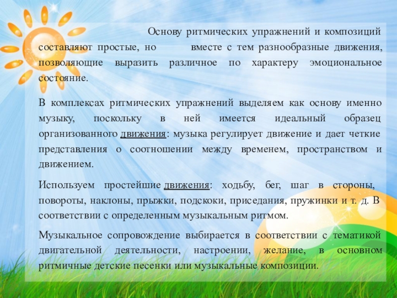 Основу ритмических упражнений и композиций составляют простые, но вместе с тем разнообразные движения, позволяющие выразить различное по характеру эмоциональное состояние.