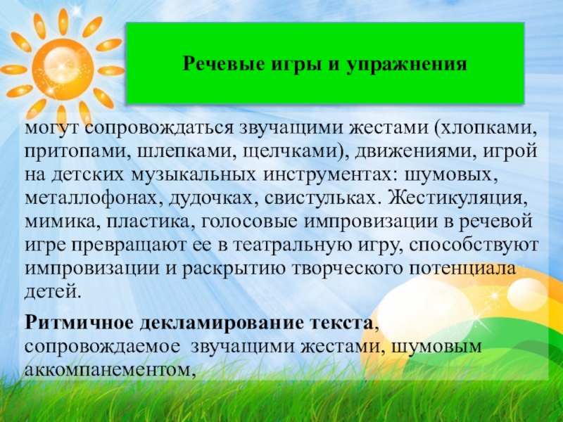 щелчками), движениями, игрой на детских музыкальных инструментах: шумовых, металлофонах, дудочках, свистульках. Жестикуляция, мимика, пластика, голосовые импровизации в речевой игре превращают ее в театральную игру, способствуют импровизации и раскрытию творческого потенциала детей.