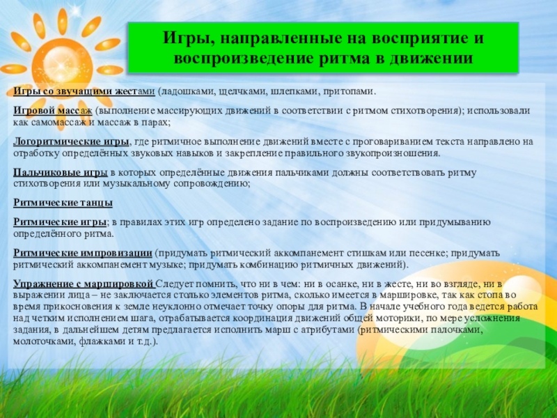 Слайд 16Игры, направленные на восприятие и воспроизведение ритма в движении