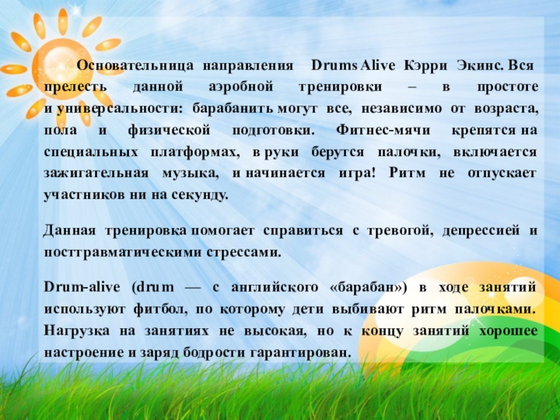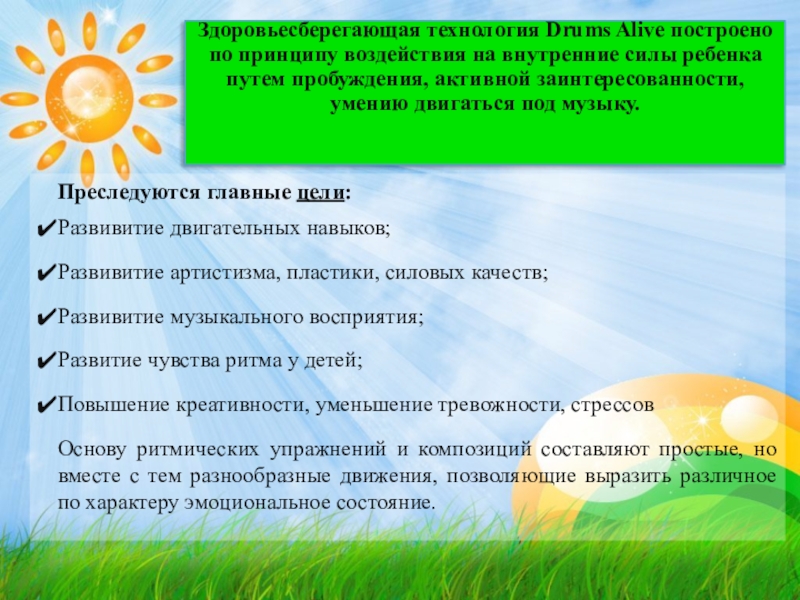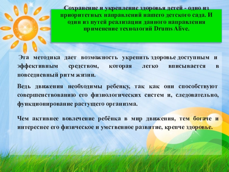 Слайд 2Здоровьесберегающая технология Drums Alive построено по принципу воздействия на внутренние силы ребенка