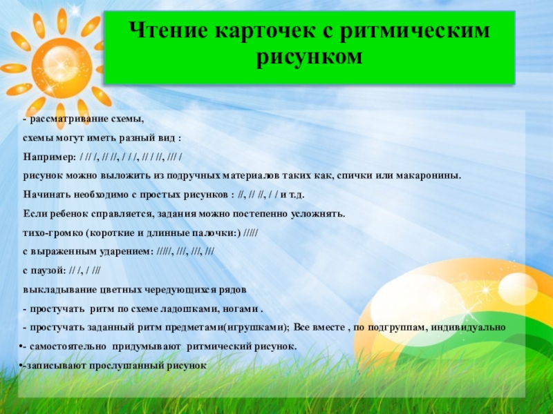 - узнавать знакомую попевку или танец по ритмическому рисунку (на слух или по карточке)