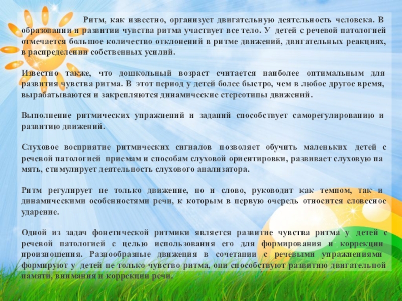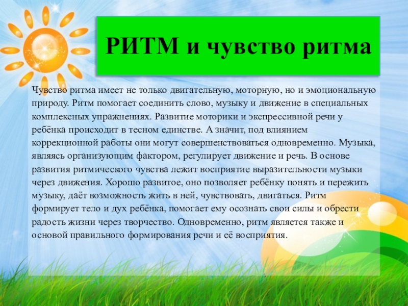 и эмоциональную природу. Ритм помогает соединить слово, музыку и движение в специальных комплексных упражнениях. Развитие моторики и экспрессивной речи у ребёнка происходит в тесном единстве. А значит, под влиянием коррекционной работы они могут совершенствоваться одновременно. Музыка, являясь организующим фактором, регулирует движение и речь. В основе развития ритмического чувства лежит восприятие выразительности музыки через движения. Хорошо развитое, оно позволяет ребёнку понять и пережить музыку, даёт возможность жить в ней, чувствовать, двигаться. Ритм формирует тело и дух ребёнка, помогает ему осознать свои силы и обрести радость жизни через творчество. Одновременно, ритм является также и основой правильного формирования речи и её восприятия.