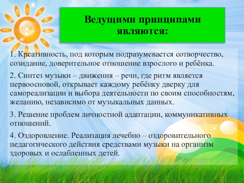 4. Оздоровление. Реализация лечебно – оздоровительного педагогического действия средствами музыки на организм здоровых и ослабленных детей.