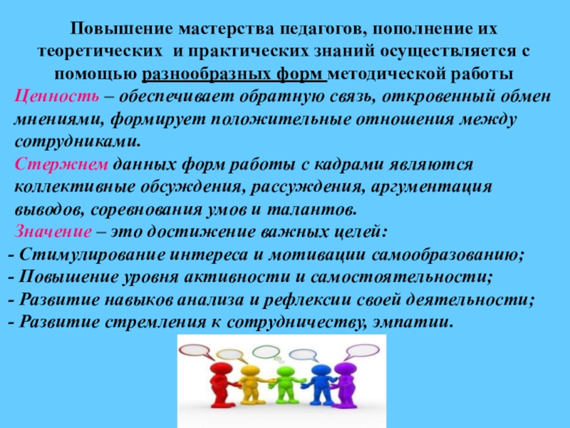 Повышение мастерства педагогов, пополнение их теоретических и практических знаний осуществляется с помощью разнообразных форм методической работыЦенность – обеспечивает обратную связь, откровенный обмен мнениями, формирует положительные отношения между сотрудниками.Стержнем данных форм работы с кадрами являются коллективные обсуждения,