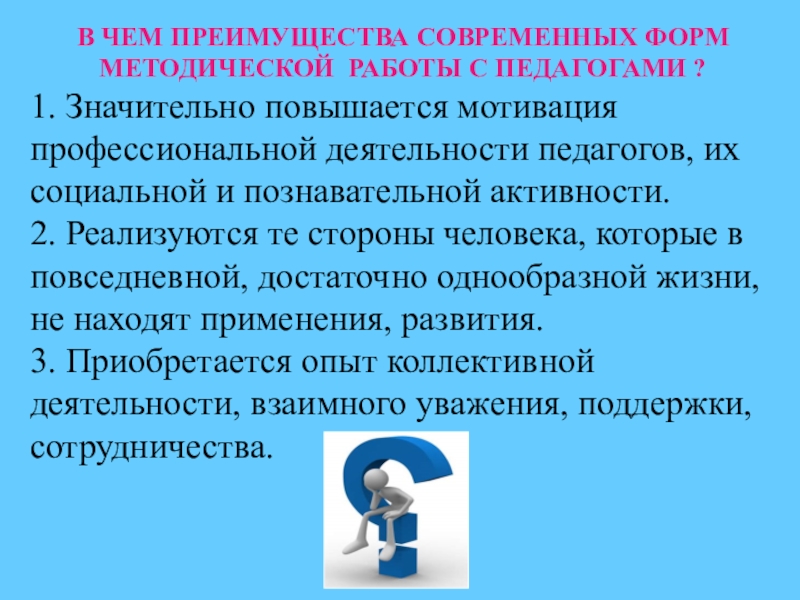 В ЧЕМ ПРЕИМУЩЕСТВА СОВРЕМЕННЫХ ФОРМ МЕТОДИЧЕСКОЙ РАБОТЫ С ПЕДАГОГАМИ ?1. Значительно повышается мотивация профессиональной деятельности педагогов, их