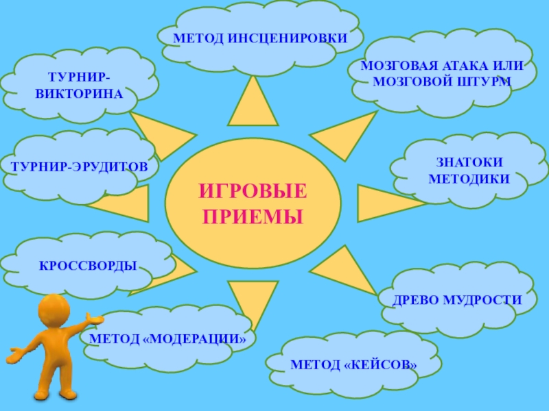 ИГРОВЫЕ ПРИЕМЫТУРНИР-ВИКТОРИНАТУРНИР-ЭРУДИТОВМОЗГОВАЯ АТАКА ИЛИ МОЗГОВОЙ ШТУРМЗНАТОКИ МЕТОДИКИДРЕВО МУДРОСТИКРОССВОРДЫМЕТОД ИНСЦЕНИРОВКИМЕТОД «КЕЙСОВ»МЕТОД «МОДЕРАЦИИ»