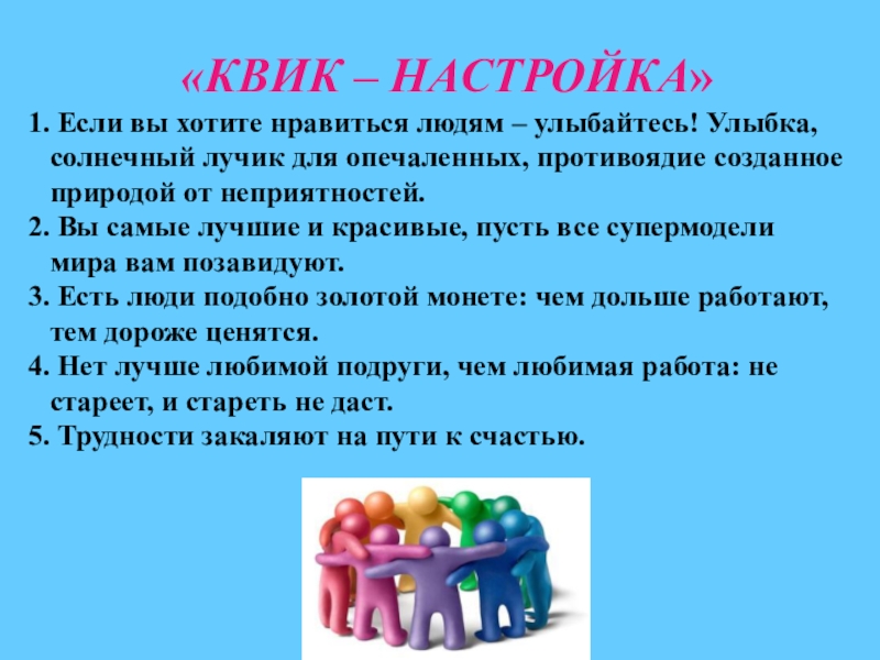 «КВИК – НАСТРОЙКА» Если вы хотите нравиться людям – улыбайтесь! Улыбка, солнечный лучик для опечаленных, противоядие созданное