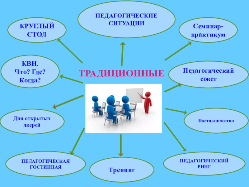 ТРАДИЦИОННЫЕСеминар-практикумКРУГЛЫЙ СТОЛПЕДАГОГИЧЕСКАЯ ГОСТИННАЯПЕДАГОГИЧЕСКИЙ РИНГПЕДАГОГИЧЕСКИЕ СИТУАЦИИКВН.Что? Где? Когда?Педагогический советНаставничествоТренингДни открытых дверей