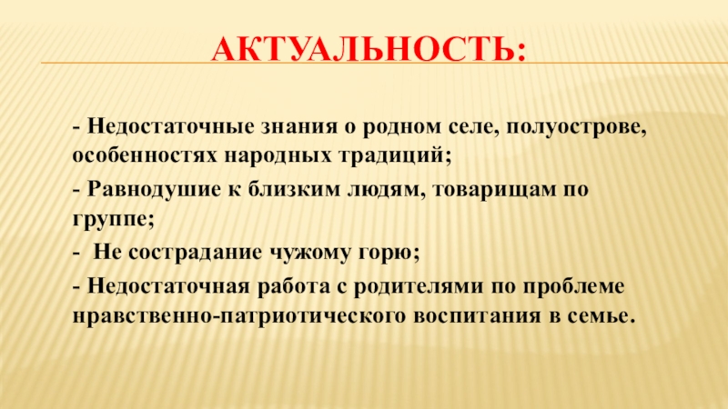 - Недостаточные знания о родном селе, полуострове, особенностях народных традиций;