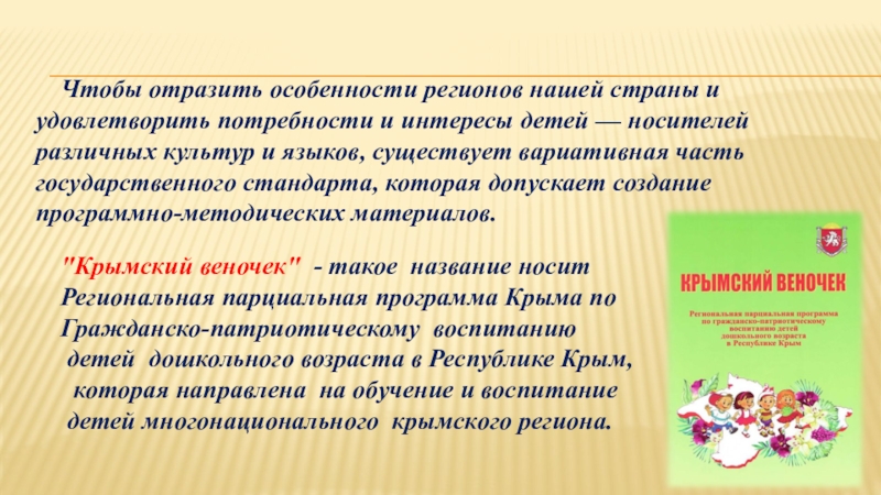 детей — носителей различных культур и языков, существует вариативная часть государственного стандарта, которая допускает создание программно-методических материалов.