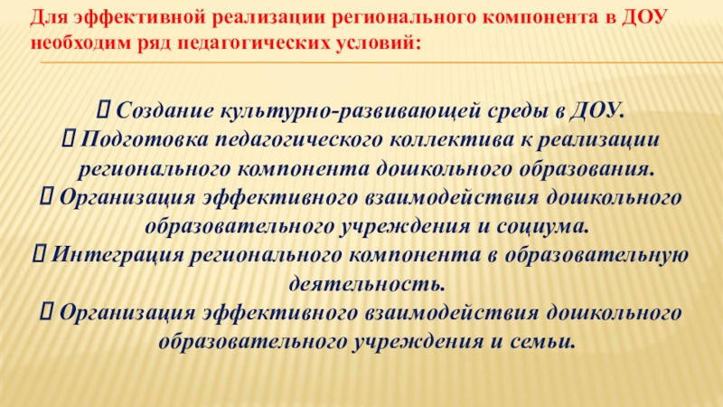 Слайд 6Для эффективной реализации регионального компонента в ДОУ необходим ряд педагогических условий: