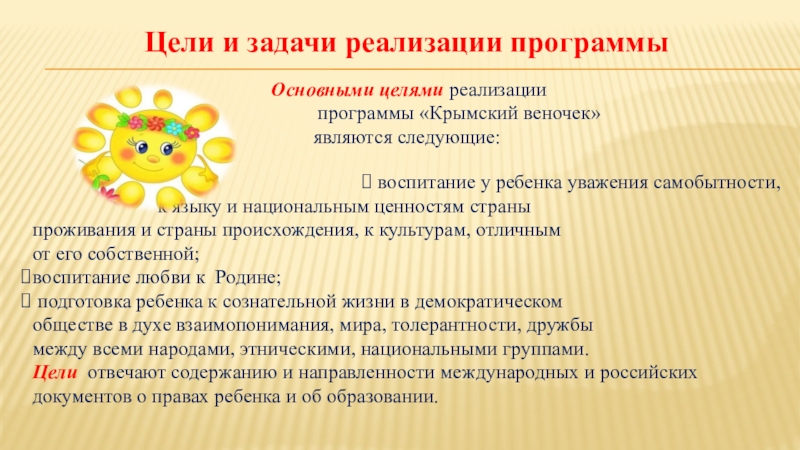 Цели отвечают содержанию и направленности международных и российских документов о правах ребенка и об образовании.
