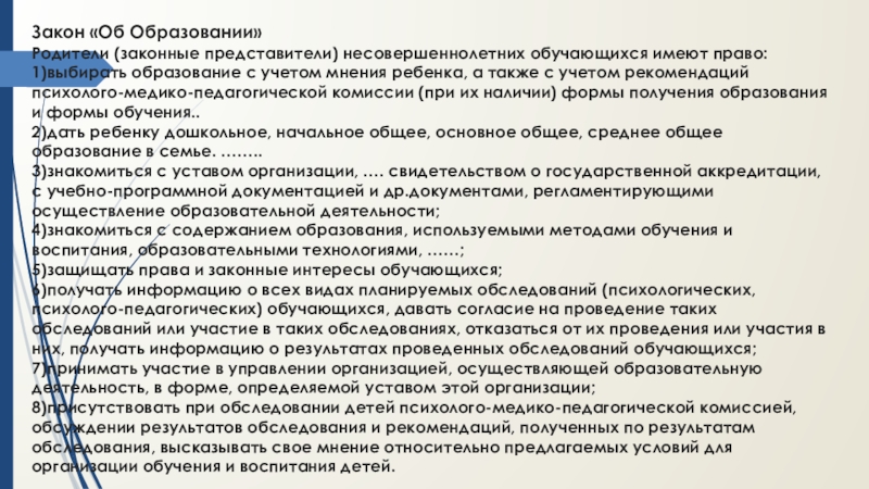 8)присутствовать при обследовании детей психолого-медико-педагогической комиссией, обсуждении результатов обследования и рекомендаций, полученных по результатам обследования, высказывать свое мнение относительно предлагаемых условий для организации обучения и воспитания детей.
