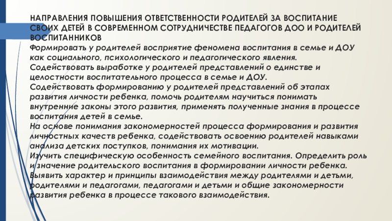Слайд 6НАПРАВЛЕНИЯ ПОВЫШЕНИЯ ОТВЕТСТВЕННОСТИ РОДИТЕЛЕЙ ЗА ВОСПИТАНИЕ СВОИХ ДЕТЕЙ В СОВРЕМЕННОМ СОТРУДНИЧЕСТВЕ