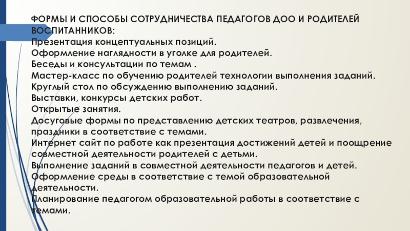 Слайд 8ФОРМЫ И СПОСОБЫ СОТРУДНИЧЕСТВА ПЕДАГОГОВ ДОО И РОДИТЕЛЕЙ ВОСПИТАННИКОВ: