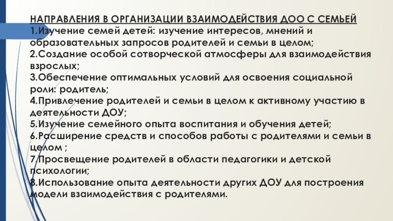 Слайд 7НАПРАВЛЕНИЯ В ОРГАНИЗАЦИИ ВЗАИМОДЕЙСТВИЯ ДОО С СЕМЬЕЙ