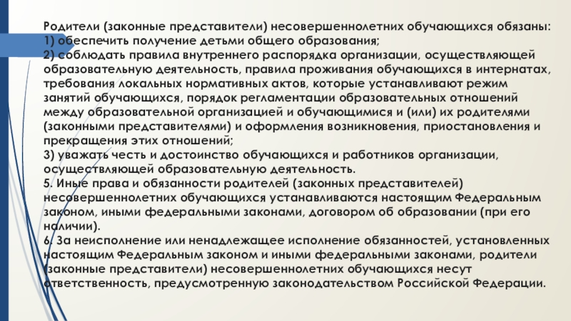 6. За неисполнение или ненадлежащее исполнение обязанностей, установленных настоящим Федеральным законом и иными федеральными законами, родители (законные представители) несовершеннолетних обучающихся несут ответственность, предусмотренную законодательством Российской Федерации.