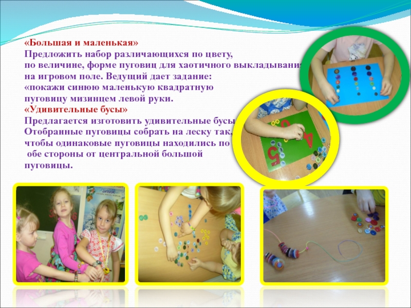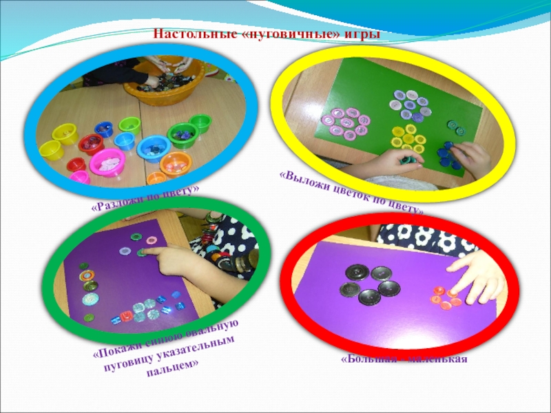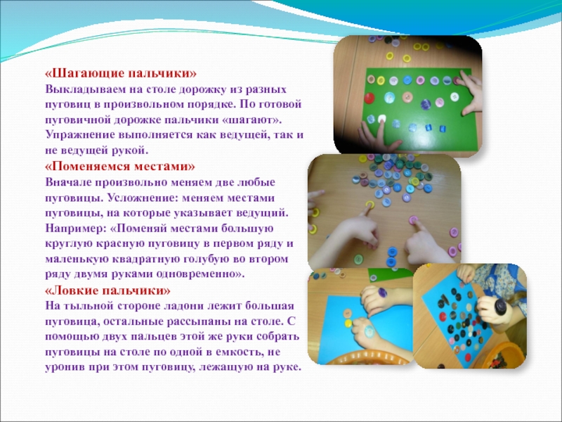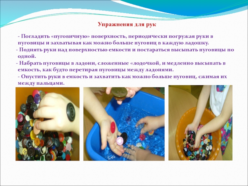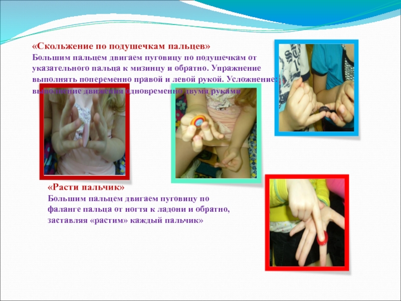 Большим пальцем двигаем пуговицу по фаланге пальца от ногтя к ладони и обратно, заставляя «растим» каждый пальчик»