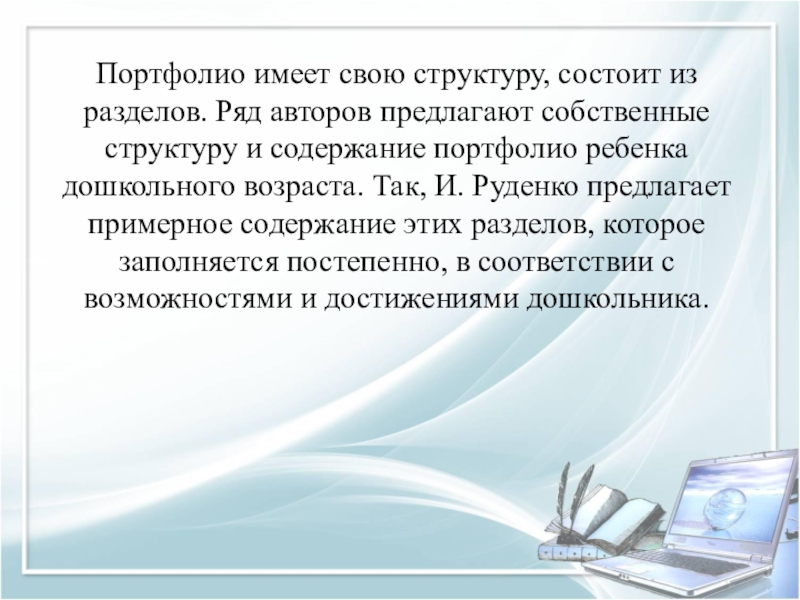 Слайд 24Портфолио имеет свою структуру, состоит из разделов. Ряд авторов предлагают собственные