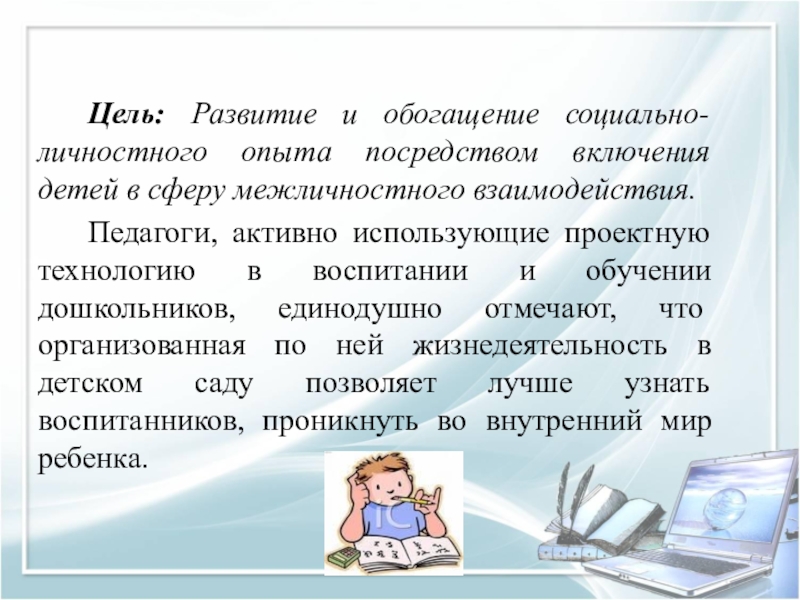 Слайд 10 Цель: Развитие и обогащение социально-личностного опыта посредством включения детей в сферу