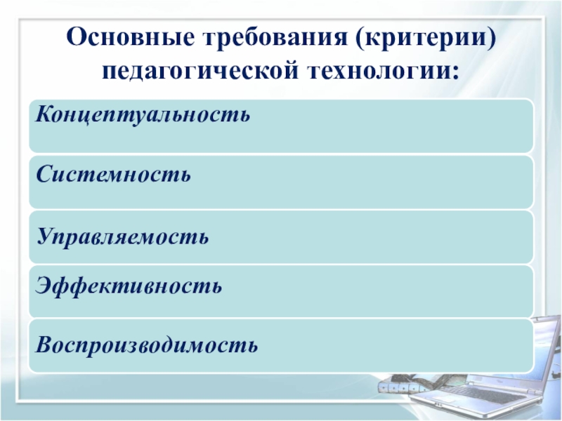 Слайд 5Основные требования (критерии) педагогической технологии: