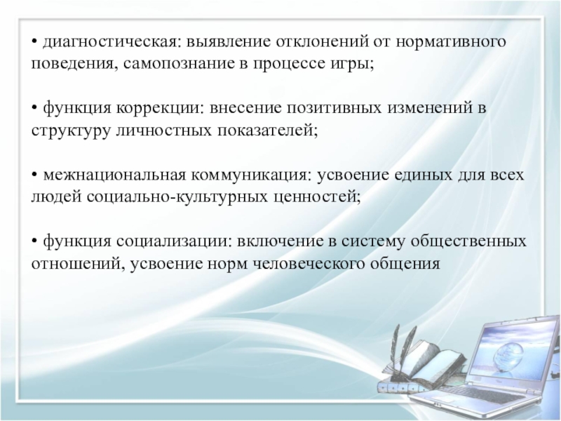 Слайд 32• диагностическая: выявление отклонений от нормативного поведения, самопознание в процессе игры;