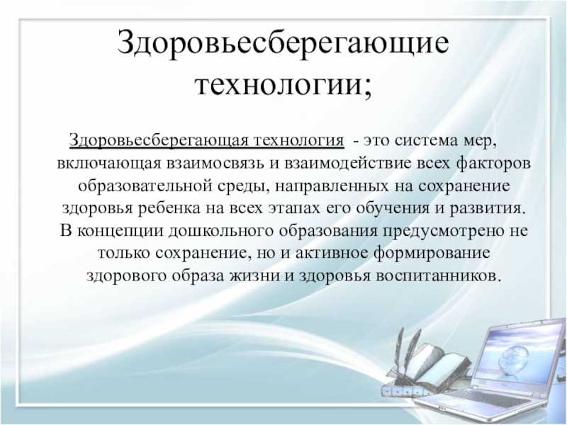 факторов образовательной среды, направленных на сохранение здоровья ребенка на всех этапах его обучения и развития. В концепции дошкольного образования предусмотрено не только сохранение, но и активное формирование здорового образа жизни и здоровья воспитанников.