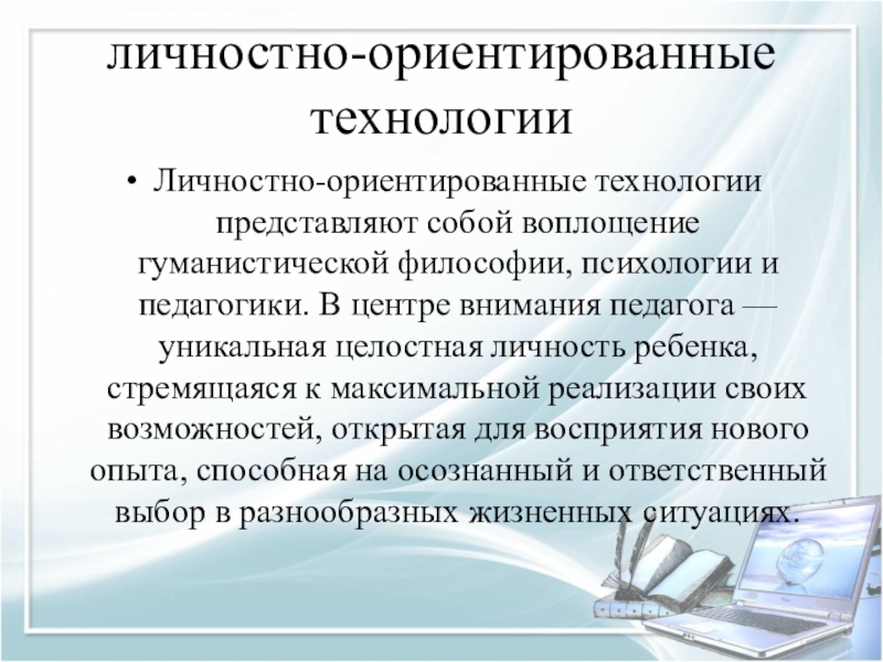 Личностно-ориентированные технологии представляют собой воплощение гуманистической философии, психологии и педагогики.