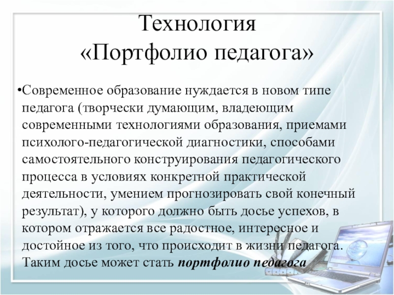 владеющим современными технологиями образования, приемами психолого-педагогической диагностики, способами самостоятельного конструирования педагогического процесса в условиях конкретной практической деятельности, умением прогнозировать свой конечный результат), у которого должно быть досье успехов, в котором отражается все радостное, интересное и достойное из того, что происходит в жизни педагога. Таким досье может стать портфолио педагога