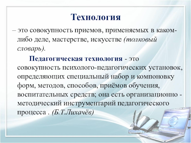 Педагогическая технология - это совокупность психолого-педагогических установок, определяющих специальный набор и компоновку форм, методов, способов, приёмов обучения, воспитательных средств; она есть организационно - методический инструментарий педагогического процесса . (Б.Т.Лихачёв)