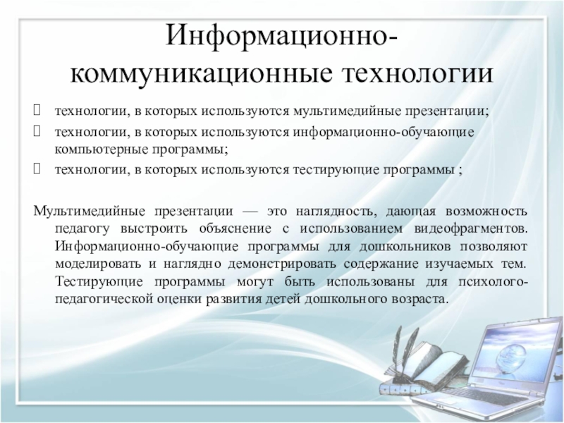Мультимедийные презентации — это наглядность, дающая возможность педагогу выстроить объяснение с использованием видеофрагментов. Информационно-обучающие программы для дошкольников позволяют моделировать и наглядно демонстрировать содержание изучаемых тем. Тестирующие программы могут быть использованы для психолого-педагогической оценки развития детей дошкольного возраста.