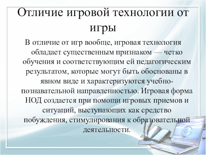 обладает существенным признаком — четко обучения и соответствующим ей педагогическим результатом, которые могут быть обоснованы в явном виде и характеризуются учебно-познавательной направленностью. Игровая форма НОД создается при помощи игровых приемов и ситуаций, выступающих как средство побуждения, стимулирования к образовательной деятельности.