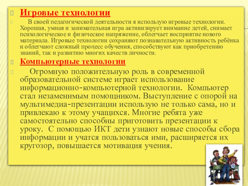 технологии. Хорошая, умная и занимательная игра активизирует внимание детей, снимает психологическое и физическое напряжение, облегчает восприятие нового материала. Игровые технологии сохраняют познавательную активность ребёнка и облегчают сложный процесс обучения, способствуют как приобретению знаний, так и развитию многих качеств личности.