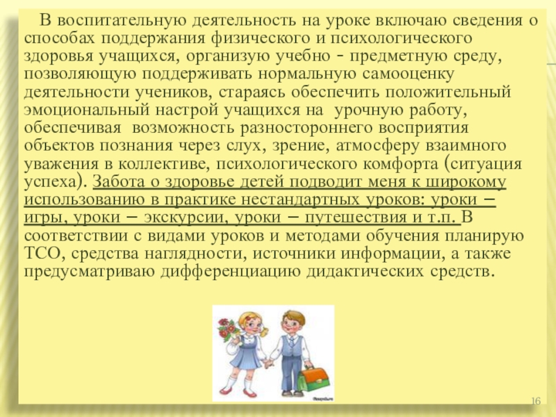 поддержания физического и психологического здоровья учащихся, организую учебно - предметную среду, позволяющую поддерживать нормальную самооценку деятельности учеников, стараясь обеспечить положительный эмоциональный настрой учащихся на урочную работу, обеспечивая возможность разностороннего восприятия объектов познания через слух, зрение, атмосферу взаимного уважения в коллективе, психологического комфорта (ситуация успеха). Забота о здоровье детей подводит меня к широкому использованию в практике нестандартных уроков: уроки – игры, уроки – экскурсии, уроки – путешествия и т.п. В соответствии с видами уроков и методами обучения планирую ТСО, средства наглядности, источники информации, а также предусматриваю дифференциацию дидактических средств.