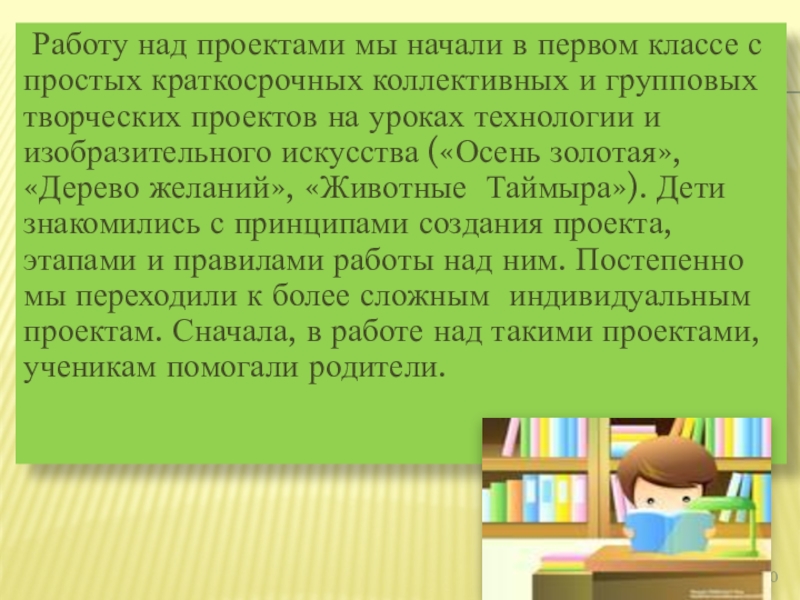 Слайд 20 Работу над проектами мы начали в первом классе с простых