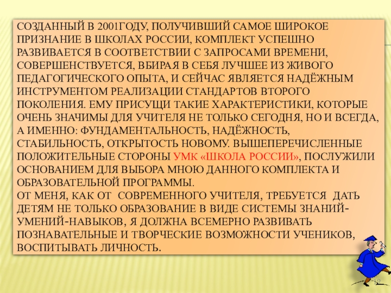 успешно развивается в соответствии с запросами времени, совершенствуется, вбирая в себя лучшее из живого педагогического опыта, и сейчас является надёжным инструментом реализации стандартов второго поколения. Ему присущи такие характеристики, которые очень значимы для учителя не только сегодня, но и всегда, а именно: фундаментальность, надёжность, стабильность, открытость новому. Вышеперечисленные положительные стороны УМК «Школа России», послужили основанием для выбора мною данного комплекта и образовательной программы.