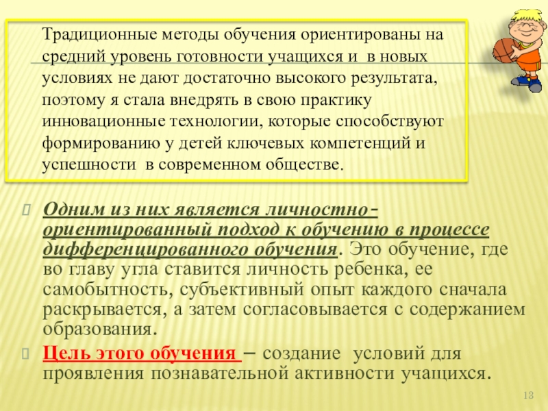 обучению в процессе дифференцированного обучения. Это обучение, где во главу угла ставится личность ребенка, ее самобытность, субъективный опыт каждого сначала раскрывается, а затем согласовывается с содержанием образования.